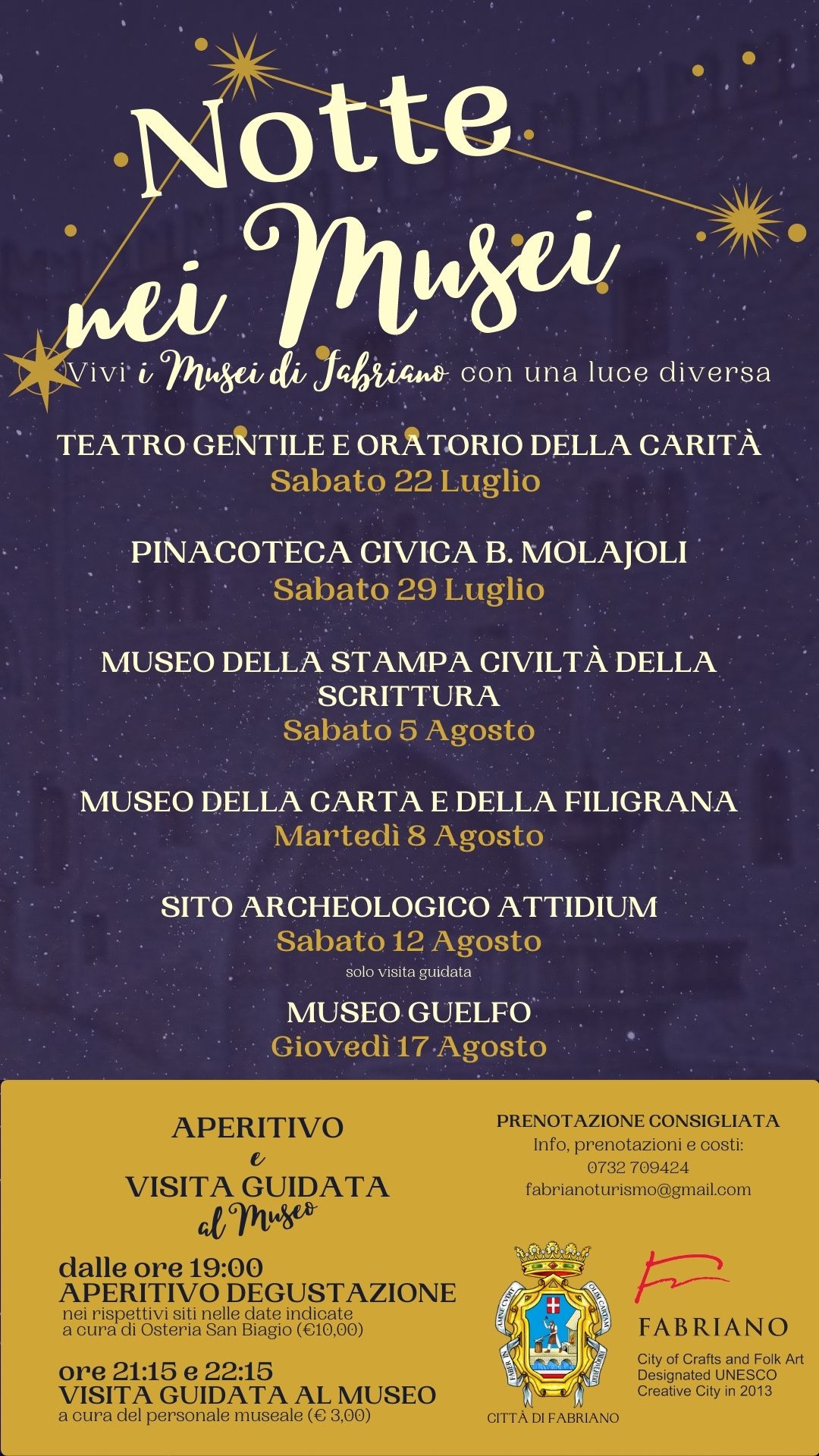 · Il Museo della Carta e della Filigrana di Fabriano vi invita Martedì 8 Agosto 2023 alla Notte nei Musei, un modo per vivere e scoprire i siti culturali della Città sotto una luce suggestiva! Un incontro che vi porterà alla scoperta delle storie di questo luogo, con la possibilità di abbinare un aperitivo degustazione a cura di Osteria San Biagio e a seguire la visita guidata, il tutto nella splendida cornice dell'ex convento di San Domenico.
